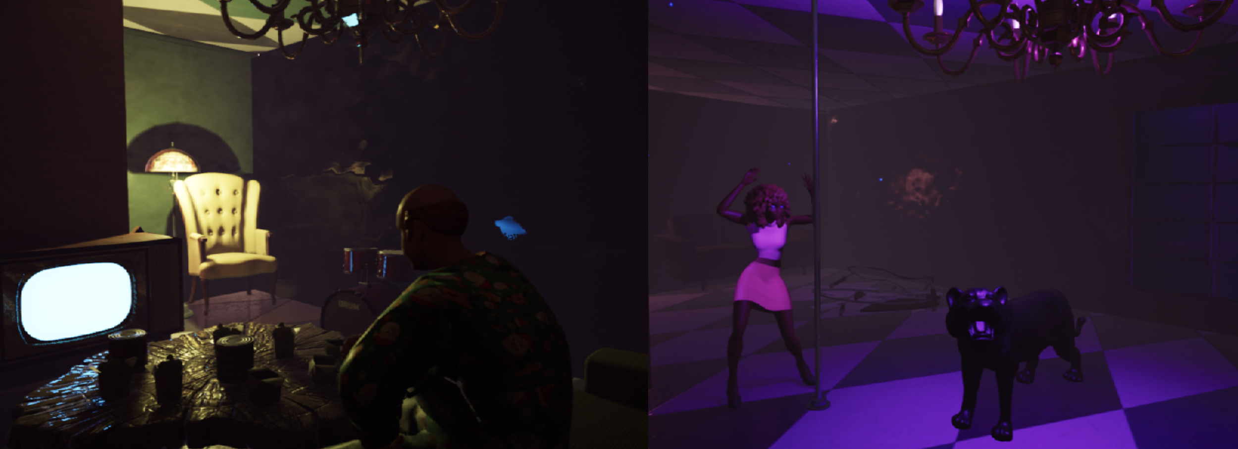 Tanya’s room - purple light, dancing pole, broken coffee table, panther statue